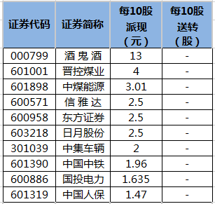 证券时报网讯,Wind统计显示,股权登记日为今日(7月28日)的共有19家上市公司。从这些公司的分红方案来看,每10股派现金额在1元(含税)及以上的共有15家。其中,每10股派现金额在1元(含税)及以上的共有15家,酒鬼酒(000799)派现最大方,每10股派现13元;晋控煤业、中煤能源紧随其后,每10股派现金额分别为4元、3.01元。
