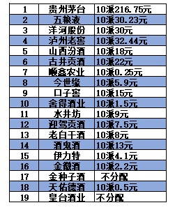 根据蓝鲸财经记者统计,19家上市白酒企业中,有17家酒企密集分红,其中贵州茅台、五粮液、洋河、泸州老窖(000568)每10股派现均在30元及以上。